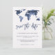 This chic, modern wedding save the date card features a white, watercolor paper look background with a trendy blue watercolor look world map and matching text. The backing of the card is covered with a blue waterolor design. Perfect for the wedding of any couple who loves to travel, or anyone having a destination wedding.