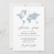 Blue watercolor world map wedding invitation card. With a beautiful blue hand painted watercolor world map and beautiful script text. Ideal for foreign location weddings or travel lovers.