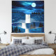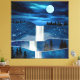 Abstract landscape scene of a a cascading waterfall with a moon, birds, and night sky and stars.