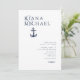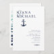 The pieces of this elegant wedding suite feature classic nautical styling with a clean, minimalist look. Stylistic waves in shades from aqua to navy blue and an anchor and rope illustration provide unique accents. An asymmetrical layout with the bride and groom's names taking precedence give this wedding invitation a striking modern look. Perfect for yacht club, boat, beachside or summer destination weddings. Search ID836 to see this complete suite and others with alternate marine element accents.