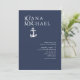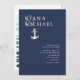The pieces of this elegant wedding suite feature classic nautical styling with a clean, minimalist look. Stylistic waves in shades from aqua to navy blue and an anchor and rope illustration provide unique accents. An asymmetrical layout in white on navy blue, with the bride and groom's names taking precedence, give this wedding invitation a striking modern twist. Perfect for yacht club, boat, beachside or summer destination weddings. Search ID836 to see this complete suite and others with alternate marine element accents.