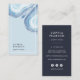 Chic watercolor business cards in a unique vertical format feature your name or company name in the lower left corner, with two geode agate slice illustrations in oceanic blue watercolor. Add your full contact information to the back in white on deep navy blue. Includes three social media icons and a template field for your username.