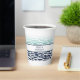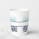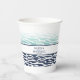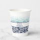 The pieces of this elegant wedding suite feature classic nautical styling with a clean, minimalist look. Stylistic waves in shades from aqua to navy blue and a seahorse illustration provide unique accents. On this coordinating paper cup, a white banner edged with navy blue over abstract waves, creates a simple but eye-catching label for your names and wedding date. Perfect for yacht club, boat, beachside or summer destination weddings. Search ID836 to see this complete suite and others with alternate marine element accents.