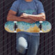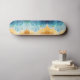 traditional watercolor design of blue ocean waves washing ashore a sandy beach on a skateboard