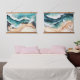 A beautiful pair of wall hangings with wood frames wit scenes at the beach in blue waves.