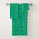 This towel set has an art deco design of blue curved lines in a triangle shape on a field of green repeated across the design. Want a different color? Message me.