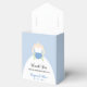 Sweet wedding favor boxes in bridal gown / wedding dress design with blue background.
