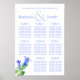 Campanula bell flower floral wedding seating plan in pretty blue, green and white. Wildflower painting on a white background. Edit this wedding seating table chart with your own seating arrangements and guests names. Perfect for those who like simplicity and romance. Ideal for both church, country style, garden and simple registry weddings. Design and fine art watercolor painting by Sarah Trett.