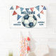 Kid's birthday party welcome banner. Any birthday. Kickin it. Soccer. Blue.