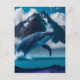 This is a generative design with a blue whale jumping out of the water with a mountain and some fog in the background.