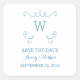 Modern and simple Whimsical Flourish Monogram Save the Date Stickers featuring an elegant swirl motif in blue. Easy to customize, simply add your initial and wedding details in the text fields provided. Click "Customize It" to find more personalization options.