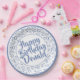 This over-the-hill design has a blue and white random number pattern with a blue milestone number 70 repeated in varied sizes and angles. There is a white circle in the center for your text and blue and white rings around the rim.
