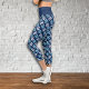 On this pair of capri leggings, a series of blue and white freehand paint stripes are placed in a alternating pattern on a darker royal blue background. A modern pattern that will become timeless.