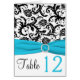This black and white damask Table Number card has an aqua blue PRINTED ribbon and PRINTED diamond jewel brooch that would be perfect for an aqua and black themed wedding. **You MUST change the number 11's to each of the table numbers you need, add it to your cart, and then return and repeat the process until you have all the individually numbered cards that you need in your cart. ALSO, if you change fonts, or the size of the font, some of the design and/or text may get cut-off. Everything will print as you see it on your monitor. I will not see changes you make, and Zazzle will NOT correct anything (typos, mis-alignment etc.). The text is all customizable. You can select one of 2 sizes for the table number card. If you need help with this product, please email me BEFORE you place your order. If you require any other matching items, please email your request to niteowlstudio@gmail.com