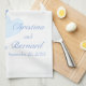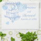 Cute love bird couple in graphic drawing of open bird cage hanging from a blossoming spring tree with hearts. Fashionable modern chic wedding design part of the bird cage romantic wedding stationary set. Edit this commemorative wedding kitchen hand towel with your bride and grooms names and special wedding date. Perfect for a wonderful unique keepsake gift to the happy couple or just to commemorate your special day. Unique drawing and design by Sarah Trett.