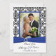 This black and white damask photo thank you card with royal blue PRINTED ON ribbon and jewels matches the wedding invitations shown below. The text and paper type are customizable. If you require any other matching items, please email your request to niteowlstudio@gmail.com.