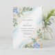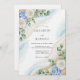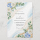 This ethereal design evokes a serene, artistic mood with its flowing watercolor washes in tranquil blues and creamy whites. Delicate white roses, soft blue hydrangeas, and verdant eucalyptus leaves intertwine, creating a harmonious blend of nature and abstract artistry. The overall palette is soft and airy, perfect for a romantic, nature-inspired event.