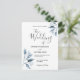 A simple, trendy wedding invitation in white, silver blue and classic blue. A chic white background on the front. Decorated with botanical silver blue colored branches and foliage. Modern large handlettered script, typography with the text: The wedding of. Templates for names and wedding details. Dark gray text.