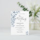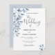 A trendy wedding invitation in white and dusty blue. A chic white background on the front. Decorated with botanical blue colored sprigs and foliage. Modern large handlettered script, typography with the text: The wedding of. Templates for names and wedding details. Dark gray text.