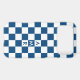 Cool iPhone case features a bold blue and white checkered pattern with a customizable monogram. Add (or delete) 3 initials or numbers in the sidebar to personalize it. The geometric checkerboard pattern is made of rows of alternating white and blue squares. Other case styles and models also available in the sidebar.