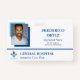 Employee ID badge with a clean minimalist design in blue, black, and white where a geometric frame in sky blue and deep blue surrounds the photo of your employee. Add your logo next to the name of the work place and the name of the department in which the employee works.