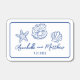 At the center, the couple’s names and wedding date appear in playful handwritten-style blue fonts. Small hand-drawn doodles of three seashells and starfish are scattered around the text, adding a whimsical seaside touch while keeping the design light and airy.