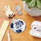 This sporty soccer keychain for boys with blue and white school colors features a simple, classic soccer ball with blue and white panels - customize the player's name and jersey number plus school and team mascot name - by katz_d_zynes