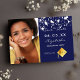 On front: Add your own vertical size photo of the graduate. A classic navy blue background color, decorated with white stars. Personalize and add a name and date. White letters. The name and the text: Save the Date are written with a modern hand lettered style script.