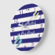 Classic navy blue and white nautical stripes. Decorated with two pair of flip flops, one in turquoise and the other one in yellow. Blue clock face numbers. With the text: Life is better in flip flops.