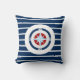 Elegant and trendy navy blue and white nautical, beach or coastal decor throw pillow with navy blue and white stripes and compass rose on one side with a red accent and a navy blue and white stripes pattern background on the other side. These fresh clean comtemporary colors and design will enhance any home, beach house, lounge, sofa, bedroom, office or boat.