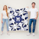 This cute basketball themed fleece blanket features a mirrored pattern of basketballs that have alternating recolored blue and white panels - the phrase "The basketball court is my happy place" in a casual handwritten-style font along with heart shapes in blue stretches between the angled rows of basketballs - athlete name and monogram can be personalized on the large overlying circle pendant - background is customizable white - easily replace the monogram with the player's varsity letter or jersey number - by katz_d_zynes