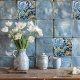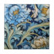 Beautiful William Morris style art tile with beautiful blue and white peonies on a dark blue background.