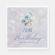 A beautiful bouquet of soft blue and white peonies decorate this birthday party napkin. The birthday description is written in an elegant, traditional calligraphy. The birthday celebrant's name is written in a classic upright font. The background is a soft-bluish gray that contains a barely there botanical pattern and bokeh lights. This item is part of the Lush Blue and White Watercolor Floral collection. It contains DIY templates you can use to create a unique invitation suite and party supplies.