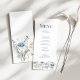 Guide guests through your reception meal with this charming blue wildflower menu card. Featuring soft watercolor florals and airy garden accents, it brings refined beauty to each place setting. Fully customizable text makes it easy to match your wedding colors and style. Perfect for elegant receptions, garden celebrations, and rustic-chic events. Professionally printed for crisp details and premium quality. Coordinates beautifully with the Blue Wildflower Garden Wedding Collection.