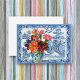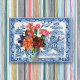 Colorful flowers in a vase are posed in front of a traditional blue willow design. The blue patterns of the vase echo the colors and style of the Asian inspired backdrop. The bright flowers have a contemporary look even though they were printed on an antique, Victorian trade card. This beautiful image can decorate invitations, announcements and the interior of your home.