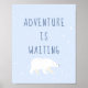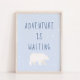 Cute blue winter snow with feature quote " Adventure is waiting ", nature explore and adventure polar bear perfect for kids nursery, children's room, bedroom, playroom and other room. personalized text and monogram and background color. Gender neutral design for both boys and girls.