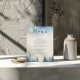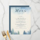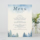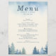 A serene blue and green watercolor forest landscape along the bottom, paired with classic blue script and serif fonts for a refined look. Perfect for rustic, outdoor, or nature-themed weddings, this menu card displays your courses and custom details in a clear, stylish layout. The soft pastel background and romantic pine tree border add a touch of tranquility to each place setting, creating a memorable dining experience for your guests