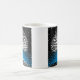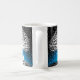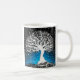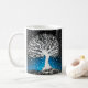 Detailed white tree silhouette on a dark blue background. Snow coming down gently. This makes a striking design for a great mug of coffee.