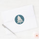 This modern round sticker features a white pine silhouette with little white snowflakes on a flat blue background.