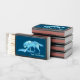 A stylized blue wolf (Canis lupus) casts a shadow as it passes through snowy terrain. Add your own text.