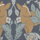 Arts and crafts inspired woodland wallpaper with a blend of modern victorian, block print, and folk art stylings. This forest animal wallpaper features bears, birds, deer, and fox, surrounded by leaves, flowers, and botanicals in shades of navy blue, brown, dusty pink, and muted green.
