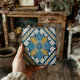 Inspired by the traditional Azulejo tiles of Spain and Portugal, this ceramic tile coaster features an intricate geometric pattern in breezy navy blue and sunny golden yellow.
