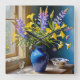 Blue Yellow Purple Bouquet Art. Capture tranquillity with this serene stylized watercolour still life of flowers in a vase with delicate blooms in blues, yellows, and purples. Perfect for wall art and greeting cards.