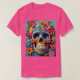 Perfect for those who love expressive, creative fashion, this shirt is ideal for artists, tattoo enthusiasts, cultural festivals, or anyone drawn to skull art with vibrant energy. The mix of warm and cool tones brings balance and beauty to the design, making it a wearable celebration of life, remembrance, and joy. Every detail, from the hand-painted look of the petals to the glowing eyes, radiates artistic passion.
