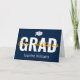 A modern play on words congratulations graduate greeting card. This graduation card features a students cap, the class year, their name, and the word "congradulations" in school colors of blue, yellow, and white.