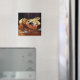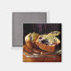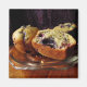 This magnet features mouth-watering blueberry muffins arranged on a shiny glass plate on a wooden table. The background is draped in a deep purple fabric.