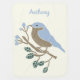 Create a berry sweet personalized gift for baby boys. This fleece baby blanket features a simple illustration of a bluebird perched on a branch with some blueberries. The graphic is in light blue, light brown and dark green. There's a spot to add a name in light blue script lettering.