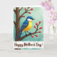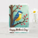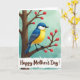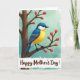 This card features a small bird perched on a curving brown branch, its head and wings shaded deep blue while its chest and belly glow sunny yellow with small touches of white. The bird faces to the right with a soft, attentive gaze that feels like a quiet nod of affection ❤️. Clusters of glossy red berries hang along the branch, adding a sweet, gift-like touch to the scene. A muted teal-green background with a watercolor texture keeps the setting calm and airy, like a peaceful morning outdoors. Light specks of white along the upper branches look like a dusting of frost, giving the image a gentle, cozy contrast 🌼. Along the bottom, a wide white band runs horizontally and holds the message “Happy Mother’s Day!” centered in dark lettering. The branch stretches in from the upper left toward the bird, with the red berries grouped near the perch and the pale background fading softly behind them.