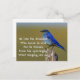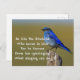This cool postcard features a stunning photo of a Mountain Bluebird with the quote, "Be like the bluebird who never is blue, for he knows from his upbringing what singing can do." Photography created by award-winning photographer Maria Jeffs.