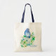 A tote bag decorated with a mountain bluebird on a Syringa, mock orange, flowering bush painted with watercolor. The design is inspired by the state bird and state flower for Idaho. You can customize the text to fit your needs.
